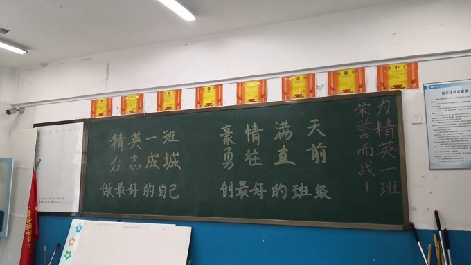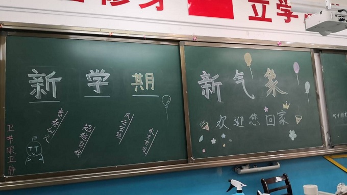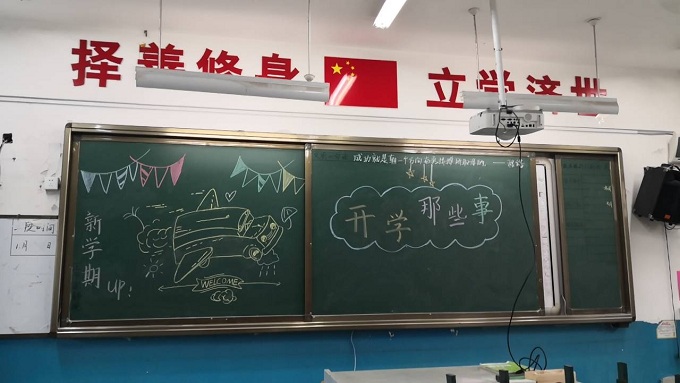 除了这些早到的同学们,八年级的各班教师、生活老师、各部门职工都早早做好准备,等待着同学们的到来,为他们做好各种开学工作。看,各班班主任和协助老师已经在黑板上写好新学期的标语,让同学们一进入教室就感受到了新的学期不一样的学习氛围。同时,各班同学撸起袖子,拿起扫帚拖把,认真地打扫布置着教室,就如同打扫自己的家一样。