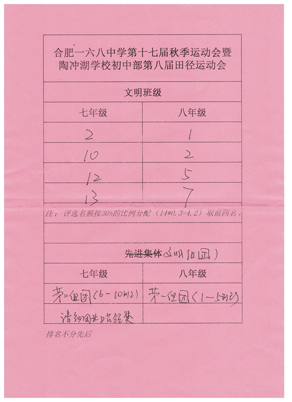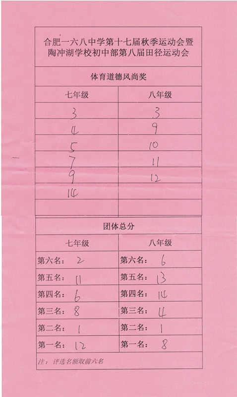 合肥一六八陶冲湖学校初中部第八届田径运动会集体获奖名单(部分)