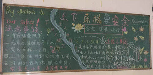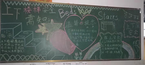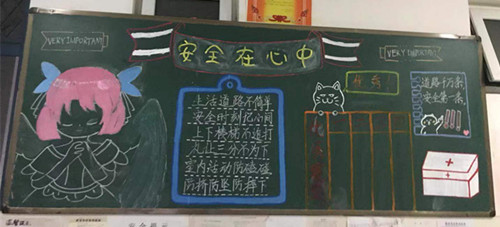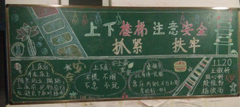 上述等等都是安全隐患之处,为了将意外伤害降至最低,学校更是想尽办法,时时处处教育学生注意自身安全,近期又呈现了一幅幅以为安全为主题的楼层长廊黑板报宣传,给同学们耳濡目染的安全提醒环境。