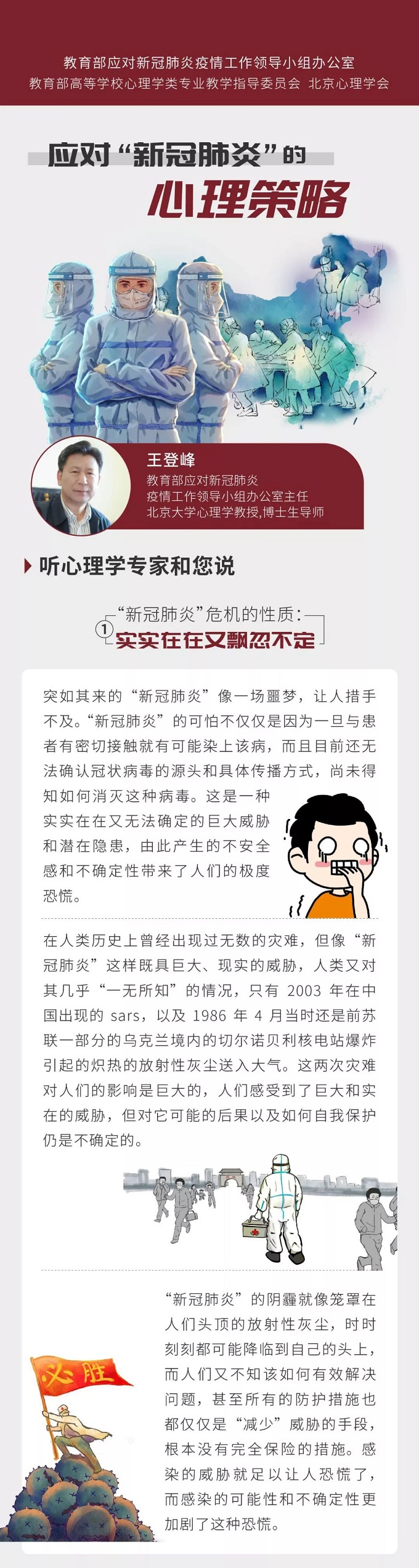 积极的心理状况是抗击疫情的重要保障,为了增强大家的“心理免疫力”,教育部应对新冠肺炎疫情工作领导小组办公室会同教育部高等学校心理学类专业教学指导委员会、北京心理学会,推出特别栏目《用“心”战“疫”》。疫情当下,关于心理方面你有什么想问的问题,也欢迎在微信评论区留言,我们将邀请专家详细解答, 为大家送上“心理处方”。今天,微言教育推出第①期,随教育小微一起来看教育部应对新冠肺炎疫情工作领导小组办公室主任,北京大学心理学教授、博士生导师王登峰给师生们带来的5大心理策略。