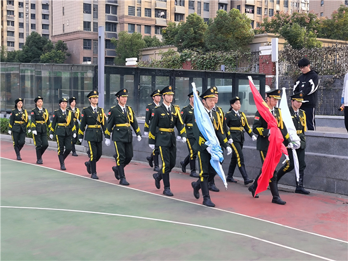 随后,国旗护卫队身着戎装,昂首挺胸,迈着整齐而坚定的步伐,护送鲜艳的五星红旗至升旗台。宏伟的国歌奏响,五星红旗冉冉升起,全体师生庄严肃立,行注目礼,高声共唱国歌,歌声整齐嘹亮,心中激情澎湃。