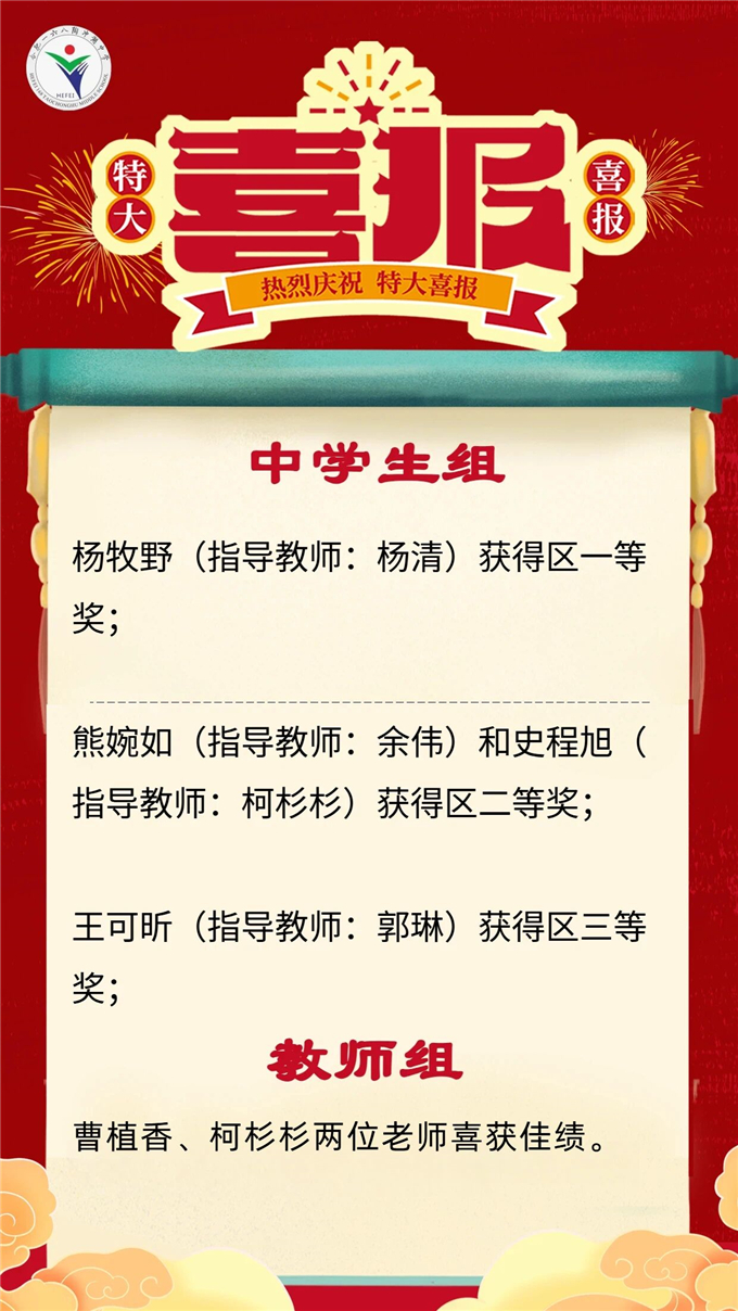 在此次高水平的区级角逐中,合肥一六八陶冲湖中学的师生们凭借扎实的语言功底、出色的现场表现和昂扬的精神风貌,一路过关斩将,最终斩获佳绩,为学校赢得了荣誉!他们分别是:中学生组杨牧野(指导教师:杨清)获得区一等奖、熊婉如(指导教师:余伟)和史程旭(指导教师:柯杉杉)获得区二等奖、王可昕(指导教师:郭琳)获得区三等奖;教师组曹植香、柯杉杉两位老师也喜获佳绩。其中,杨牧野同学被推荐参加合肥市比赛!