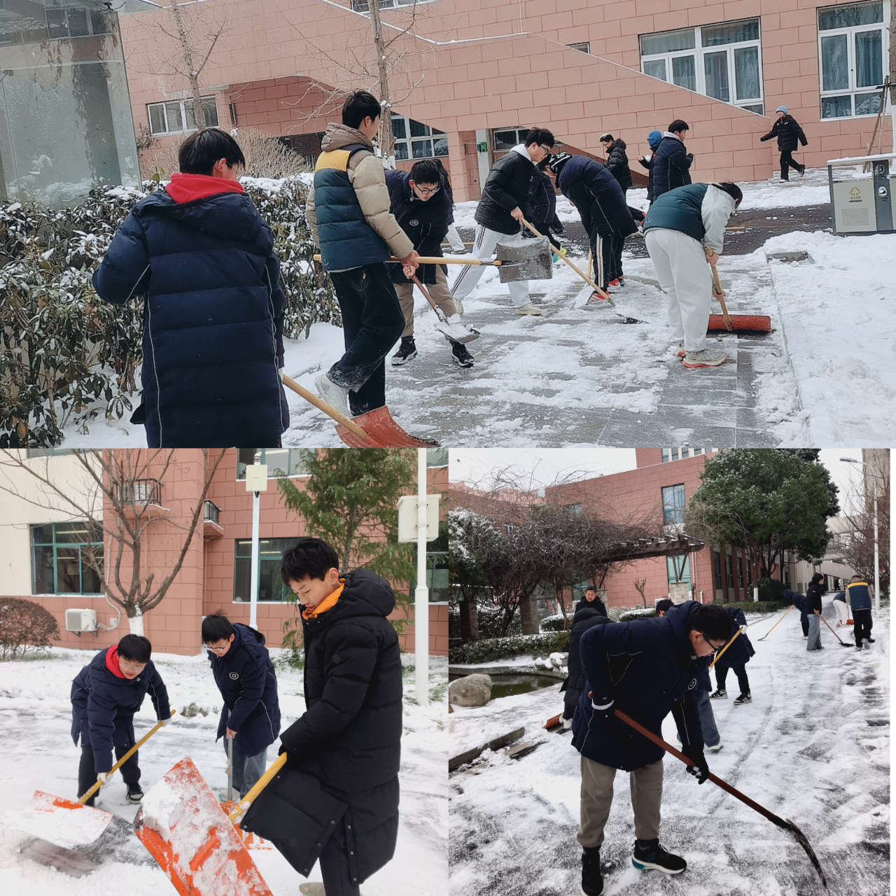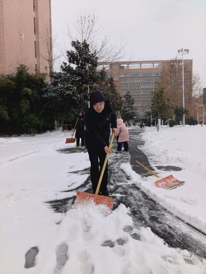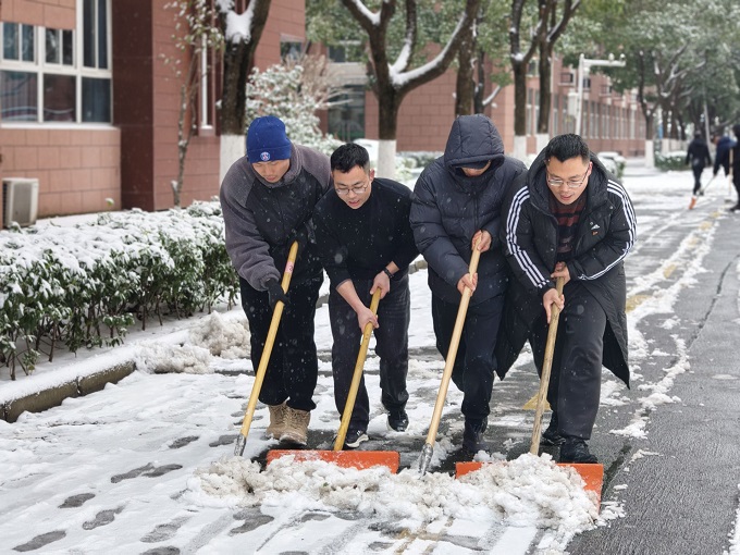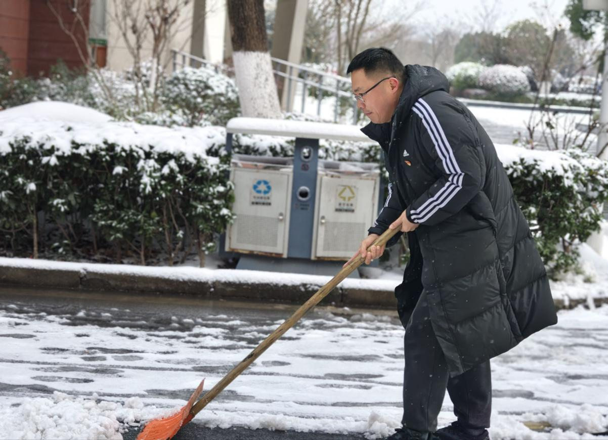 随后,更多的师生也纷纷加入铲雪队伍,大家齐心协力、干劲十足,不遗漏任何一个有安全隐患的角落。经过数小时的奋战,校园重要出入区域内的积雪被清除,师生们能够走上一条条安全畅通的“暖心通道”。